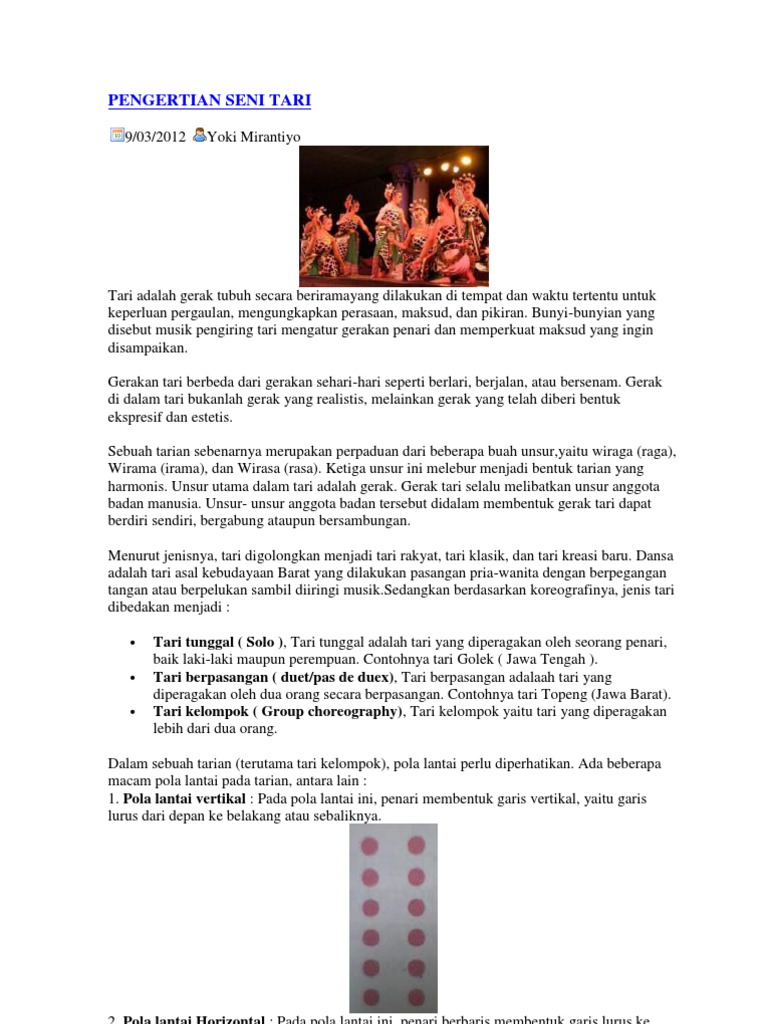 Menurut definisi seni tari dan jenisnya, tarian dibagi berdasarkan jumlah penari yaitu penari tunggal, penari berpasangan maupun penari berkelompok. Gerak pada tari upacara sangat bergantung kepada naluri untuk bergerak tanpa mengindahkan segi estetika sebuah karya seni tari. Berdasarkan bentuk penyajiannya, karya tari dibagi menjadi tiga bentuk, yaitu bentuk tari tunggal, tari berpasangan atau duet, dan tari kelompok (di dalamnya ada tari massal dan drama tari). Kelompok tari pertunjukan yang hanya ditarikan oleh seorang penari digolongkan. Menurut jenisnya fungsi tari dibagi menjadi beberapa bagian yaitu fungsi tari sebagai upacara,hiburan,pendidikan,pertunjukan,pergaulan). Tari rakyat tari yang berkembang di lingkungan masyarakat lokal, hidup dan berkembang secara turun temurun. Pameran seni seperti seni lukis&seni patung. Seni tari dan seni musik (2007), kesenian tari dibagi menjadi tiga, yaitu tari tunggal atau solo , tari duet atau pas de deux , serta tari kelompok atau group choreography. Melukis adalah kegiatan mengolah medium dua dimensi atau permukaan dari objek tiga dimensi untuk mendapat kesan tertentu. Menurut jenisnya seni rupa dapat dibagi menjadi: Bentuk tari terdiri dari penyajian, koreografi, karawitan, rias dan busana serta properti tari. Seni tari tari adalah gerak tubuh secara berirama yang dilakukan di tempat dan waktu tertentu untuk keperluan pergaulan, mengungkapkan perasaan, maksud, dan pikiran. Pengertian seni tari menurut para ahli.